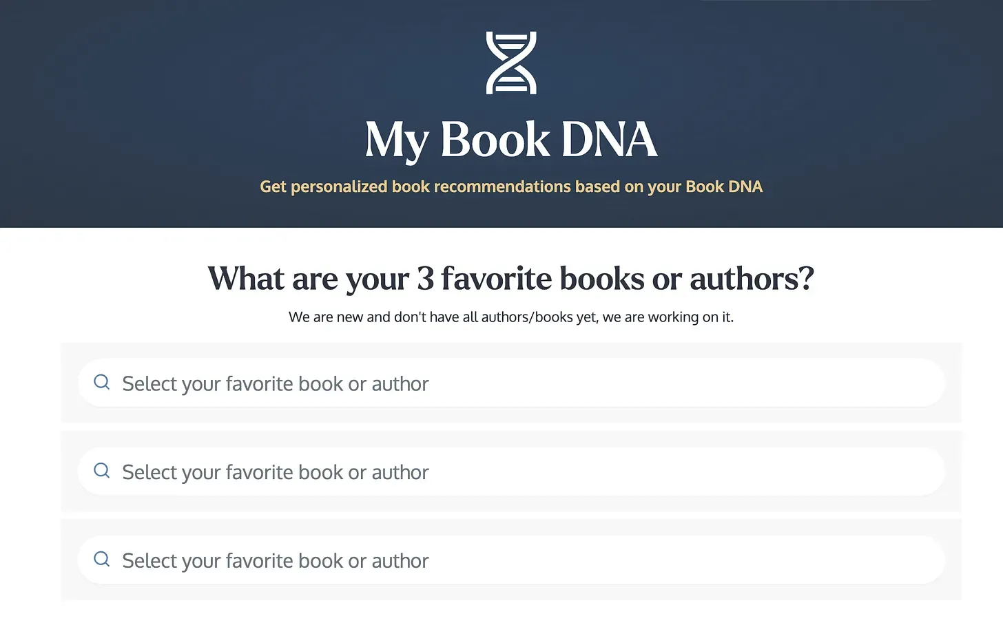 Try it here and share your 3 favorite reads (here are mine,)! This uses our new Book DNA review format that I have been testing. It is designed to help understand why you liked a book so that as we grow, we can help you find readers who share your Book DNA and deliver better recommendations.