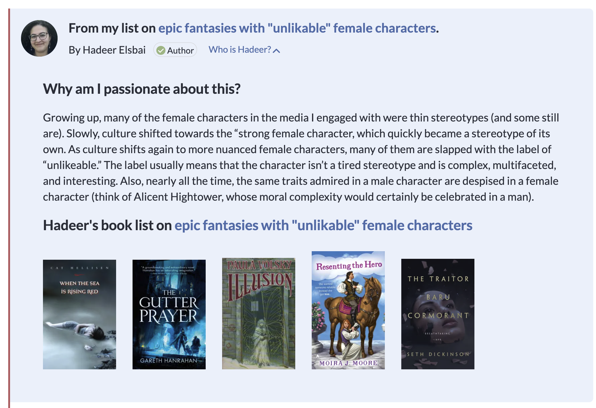 This switches the format to one column instead of two, and it shows more about the person making the recommendation (plus, you can meet them and their book). Try our bookshelf on dystopias to try it. This is the finished version as we tried a few different options during testing.