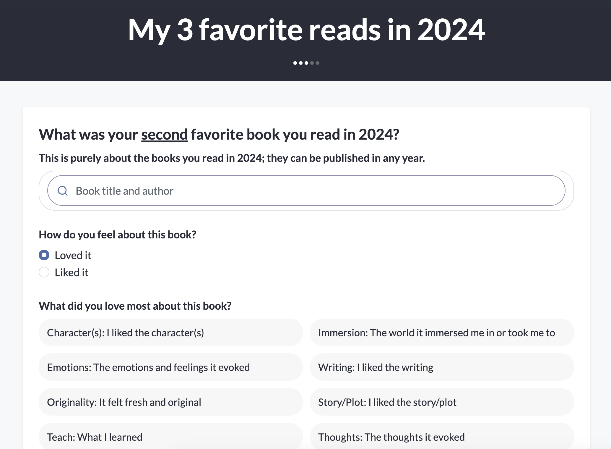 For online book communities and fan bases, we can build a custom setup for their communities to vote on their favorite reads of the year. This year, we partnered with Subreddits like LitRPG and Truelit on this, as well as authors like Michael J. Sullivan. I have a lot more plans for this feature in the coming years.