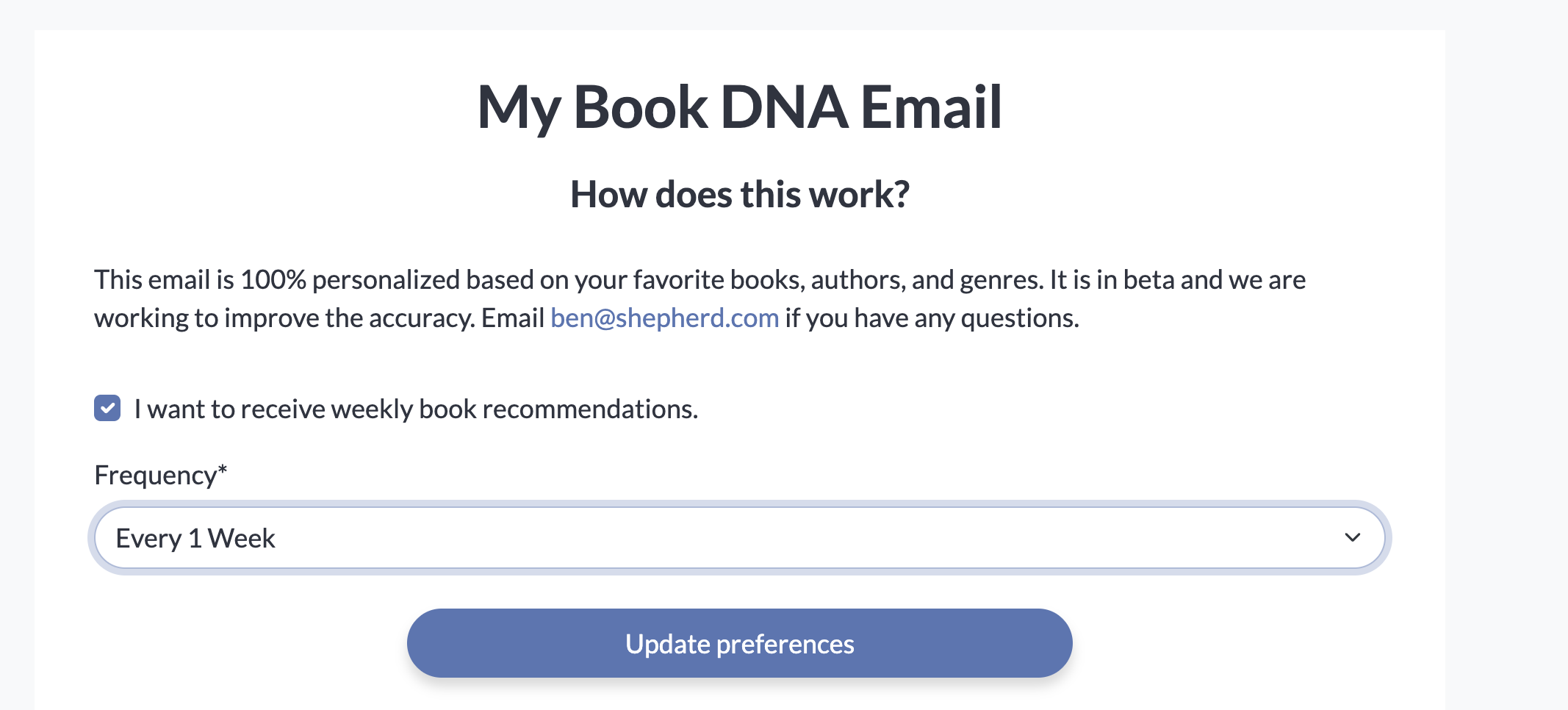 We have a personalized book newsletter where readers can input up to 6 favorite books, authors, genres, or topics. Then we email them book ideas based on their desired frequency (weekly to every 4 weeks).